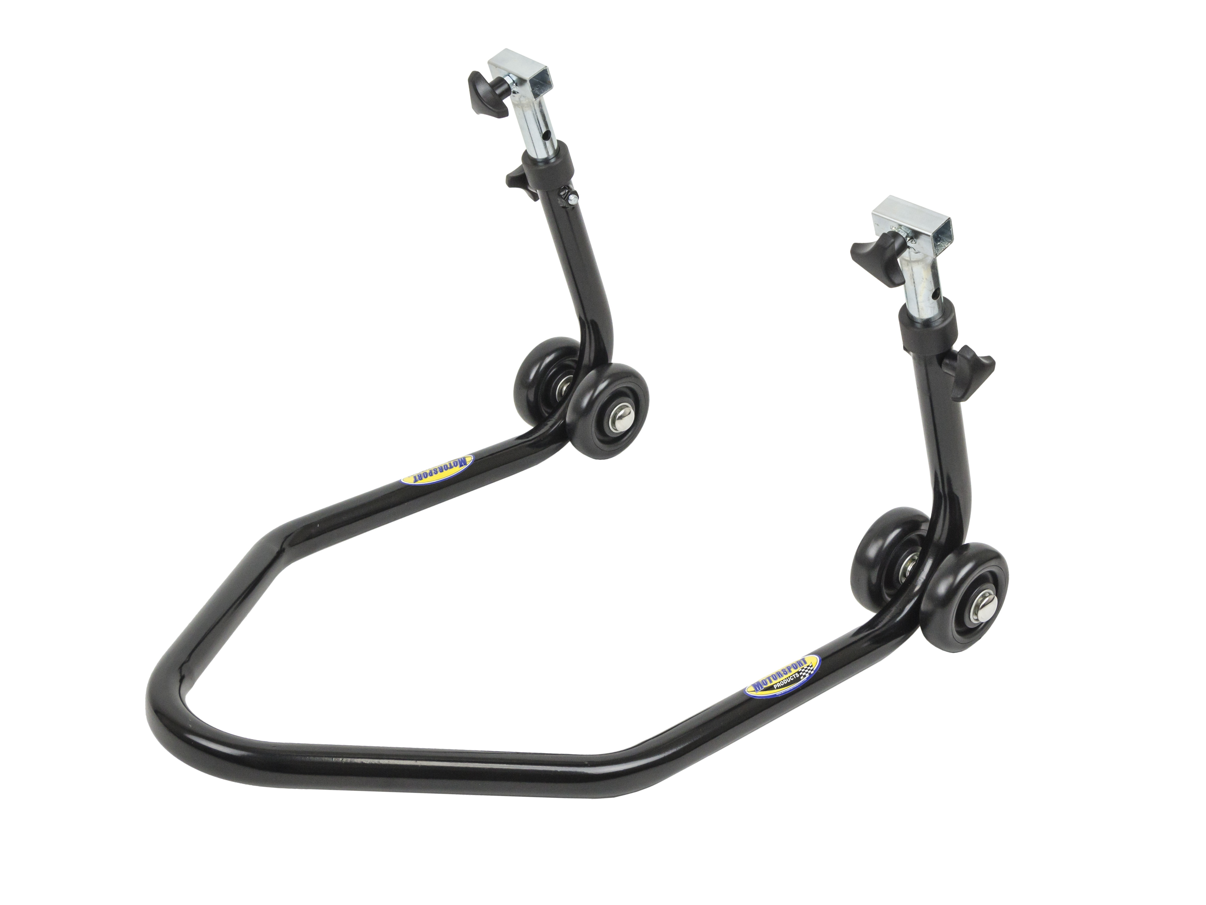 • One-piece frame constructed of heavy-duty 1 3/8” carbon steel • Sturdy frame includes four solid urethane wheels with sealed roller bearings, providing a smooth and easy transition when lifting bike • Width and Height adjusts quickly and easily without the use of tools • Black powder-coated finish IMPORTANT NOTE: The GP3 Rear Sport Bike Stand REQUIRES either the GP3 Spool Adapters (#92-8351) or GP3 Swingarm Adapters (#92-8341) for operation (adapters sold separately).